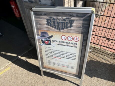 De houten achtbaan van het park, Bandit; is een zeer slechte staat. De baan is zo schokkerig dat ze voor de ingang een bord hebben neergezet dat mensen met rugklachten er niet in mogen. Maar als je geen klachten hebt zou je ze wel krijgen van deze achtbaan. Ik zat voorin (rij 1) en dat zou de minst ruwe plaats moeten zijn in de trein. Naar achter wordt het alleen nog erger. Ik zou de baan gesloten houden en afbreken. Dan GCI bellen om een nieuwe achtbaan te laten bouwen.
